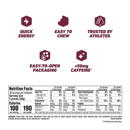 Clif Bloks Energy Chews are semisolid, easy-to-chew sources of carbohydrates–your body’s preferred source of fuel during activity. Each three-cube serving of Clif Bloks Energy Chews also contains 70 milligrams of sodium and 20 milligrams of potassium. These electrolytes support proper muscle function, so you will not get sidelined by a mid-race muscle cramp. Easy to Carry, Open, and Eat.