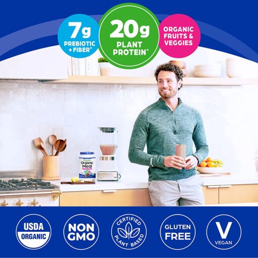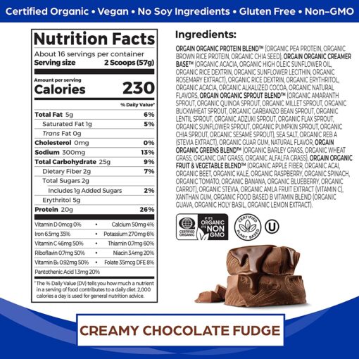 Orgain Organic Creamy Chocolate Fudge Meal Powder is a naturally smooth and delicious meal replacement drink with 20 grams of organic protein and 8 grams of organic fiber per serving. USDA organic, gluten free, kosher, vegan, non GMO, soy free. No artificial flavors, colors or preservatives. Contains an organic blend of fruits, veggies, greens, and sprouts alon grams with food based vitamins and minerals. Great when mixed with water, tasting grams delicious all on its own.